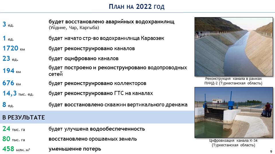 Также будет восстановлено порядка 14 тыс. гидротехнических сооружений на каналах и реконструировано 676 км коллекторов. Оцифровано 23 канала. В результате реализации вышеперечисленных мероприятий будут уменьшены ежегодные потери воды на 458 млн м3.