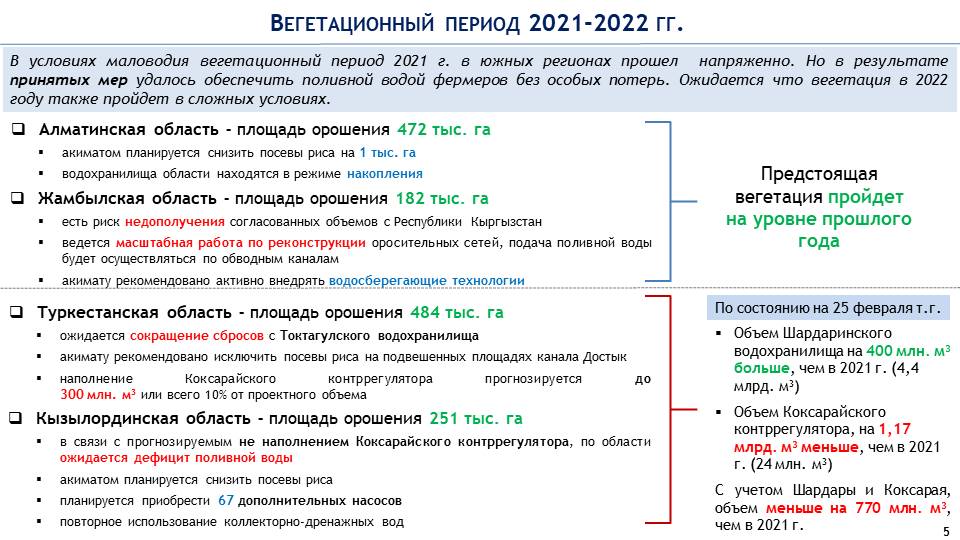 Учитывая приток по реке Сырдарья, есть большой риск недобора воды в Коксарай (всего до 300 млн м3 или 10% от проектного объема). В связи с чем, акимату Туркестанской области рекомендовано исключить посевы в районе Коксарайского контррегулятора.