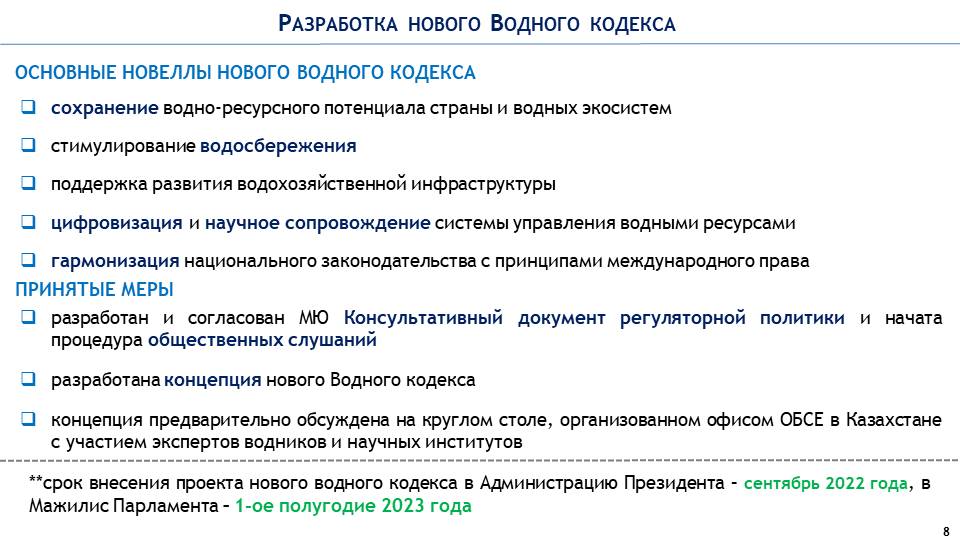 «Проведен анализ водного законодательства и опыта в области управления водными ресурсами зарубежных стран. Разработан и согласован с Министерством юстиций консультативный документ регуляторной политики, который размещен на портале открытых НПА и на сайте министерства. Разработана концепция нового Водного кодекса и сопутствующего законопроекта. Проведены консультации с экспертами и научными организациями.
