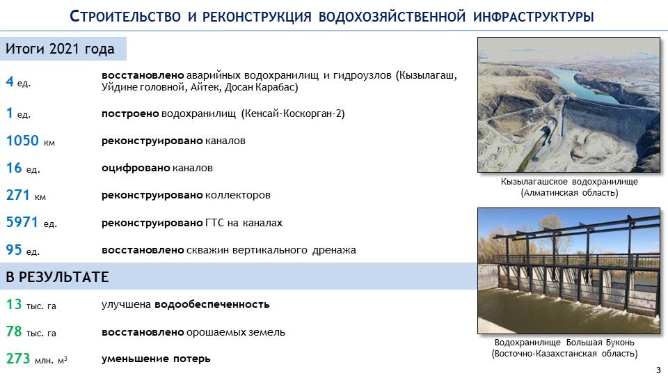 В целях снятия угрозы затопления и обеспечения безопасной эксплуатации проводится реконструкция аварийных водохранилищ и гидротехнических сооружений. Восстановлено 16 гидротехнических сооружений из них в 2021 году были восстановлены 4 объекта в Алматинской, Восточно-Казахстанской, Кызылординской и Туркестанской областях (Кызылагаш, Уйдине головной водозабор, Айтек, Досан Карабас).