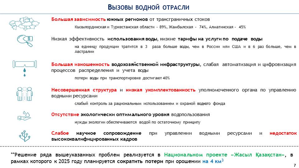 Ряд из этих проблем уже решаются в рамках Национального проекта «Жасыл Қазақстан», согласно которому к 2025 году планируется сократить потери при орошении на 4 км3, а в промышленности уменьшить объем забора свежей воды на 1,3 км3.