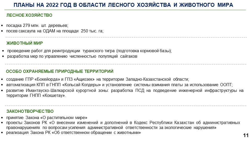 Со второго полугодия 2021 года вступил в силу новый Экологический кодекс Республики Казахстан, в рамках которого подготовлено 133 правовых акта.