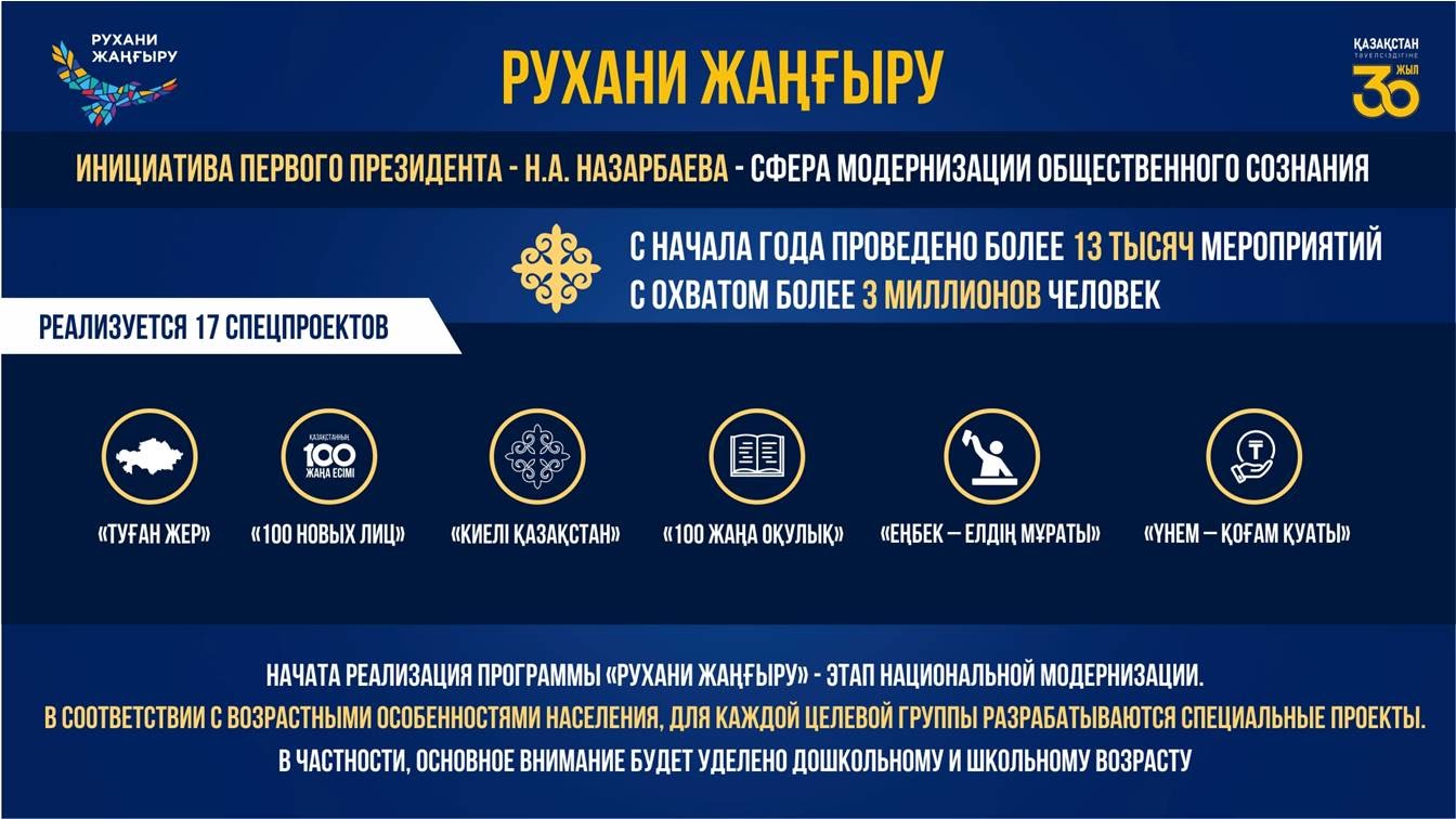 По программе, начатой из исторической статьи Первого Президента Казахстана – Елбасы Н. Назарбаева, на сегодняшний день реализуются 17 специальных проектов. С начала т.г. проведено более 13 тыс. мероприятий с охватом более 3 млн человек.