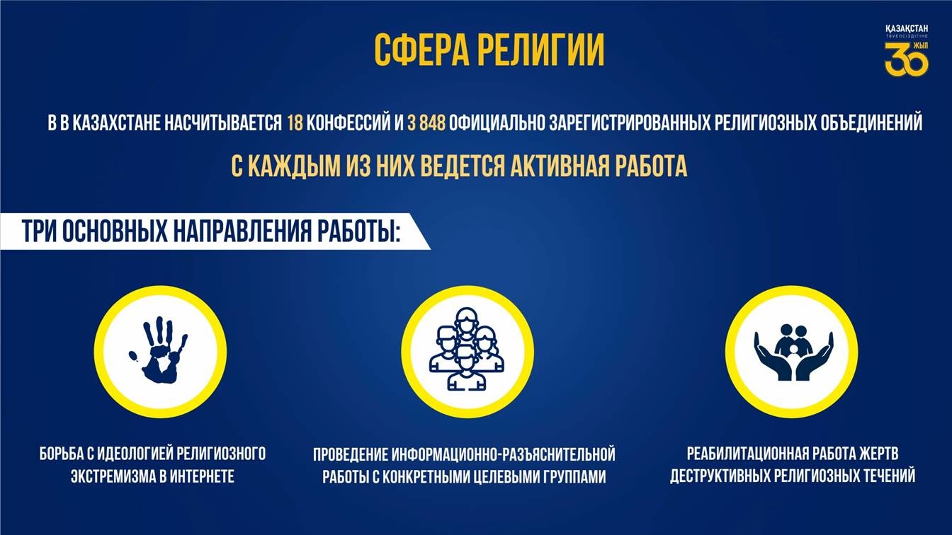 Известно, что идеология радикальных религиозных течений распространяется в основном через интернет-ресурсы. При этом, в целях предупреждения экстремистской религиозной информации проводится регулярный мониторинг интернет сайтов. В прошлом году было заблокировано 73 000 таких деструктивных материалов, через СМИ и социальные сети опубликовано более 80 000 работ по религиозному просвещению.