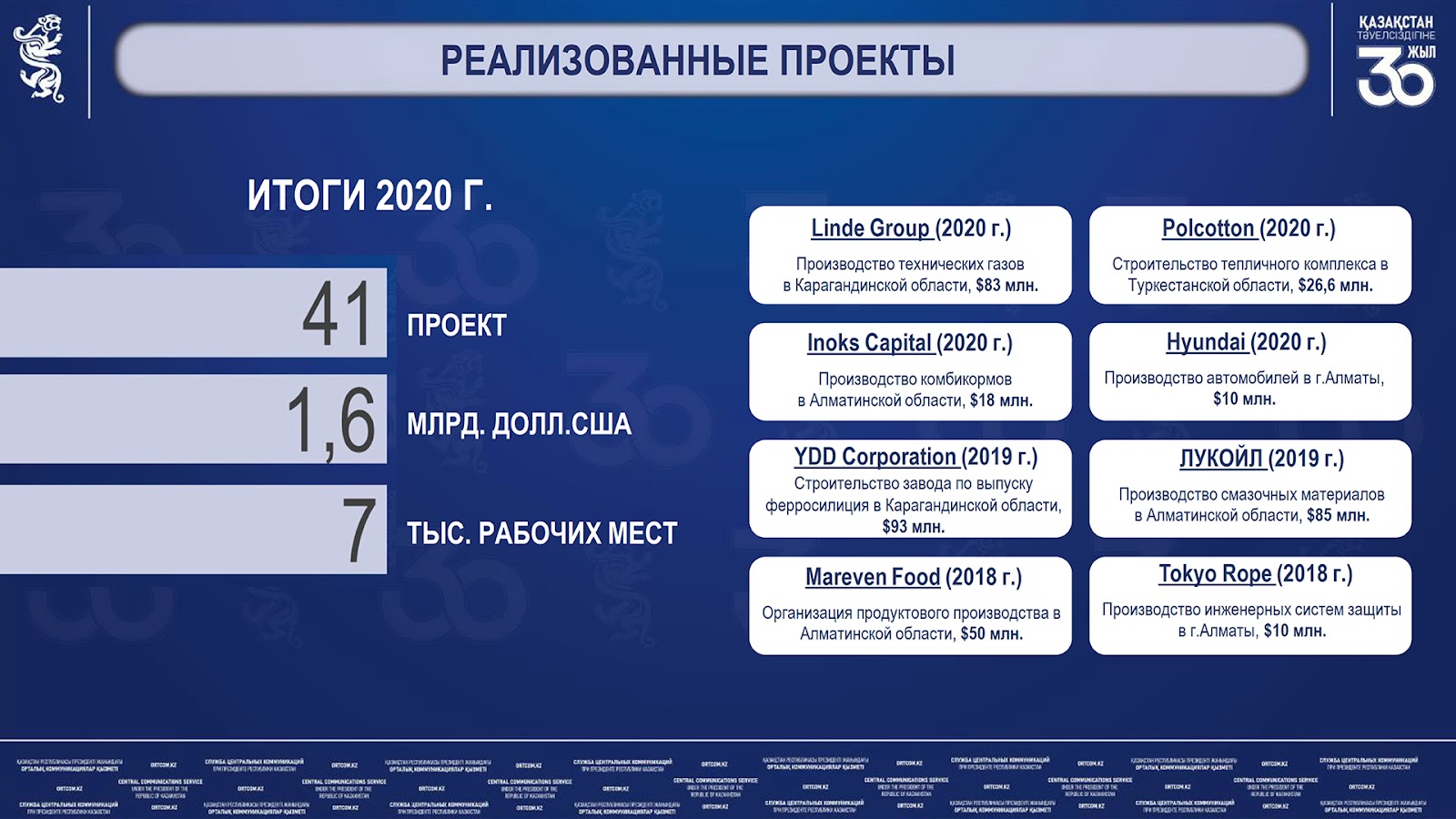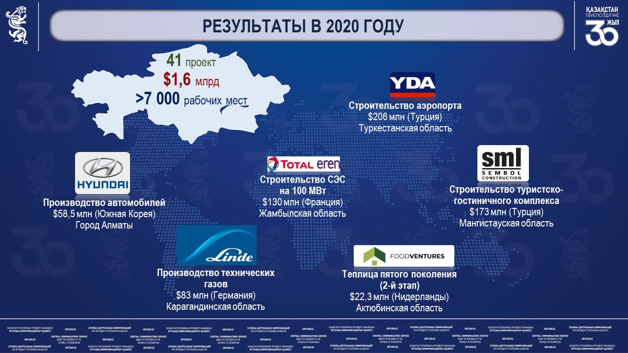 «В 2020 году совместно с центральными и местными госорганами проведена работа по определению наиболее перспективных товарных групп и нишевых проектов для организации производства в Казахстане. Подготовлены 70 инвестиционных предложений для иностранных инвесторов на сумму $2,8 млрд с привлечением международной компании. Информация по проектам включает тизер, бизнес-план и финмодель разработанные согласно международным стандартам», — председателя правления АО «НК «KAZAKH INVEST».