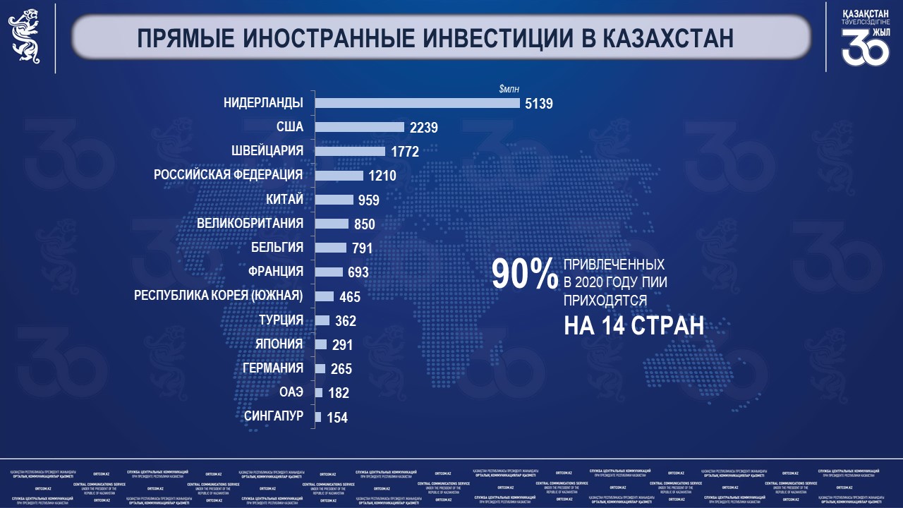 Вместе с тем, вследствие своевременно принятых мер в 2020 г. в Казахстан удалось привлечь $17,1 млрд прямых иностранных инвестиций, нивелируя снижение притоков зарубежного капитала до 30%.