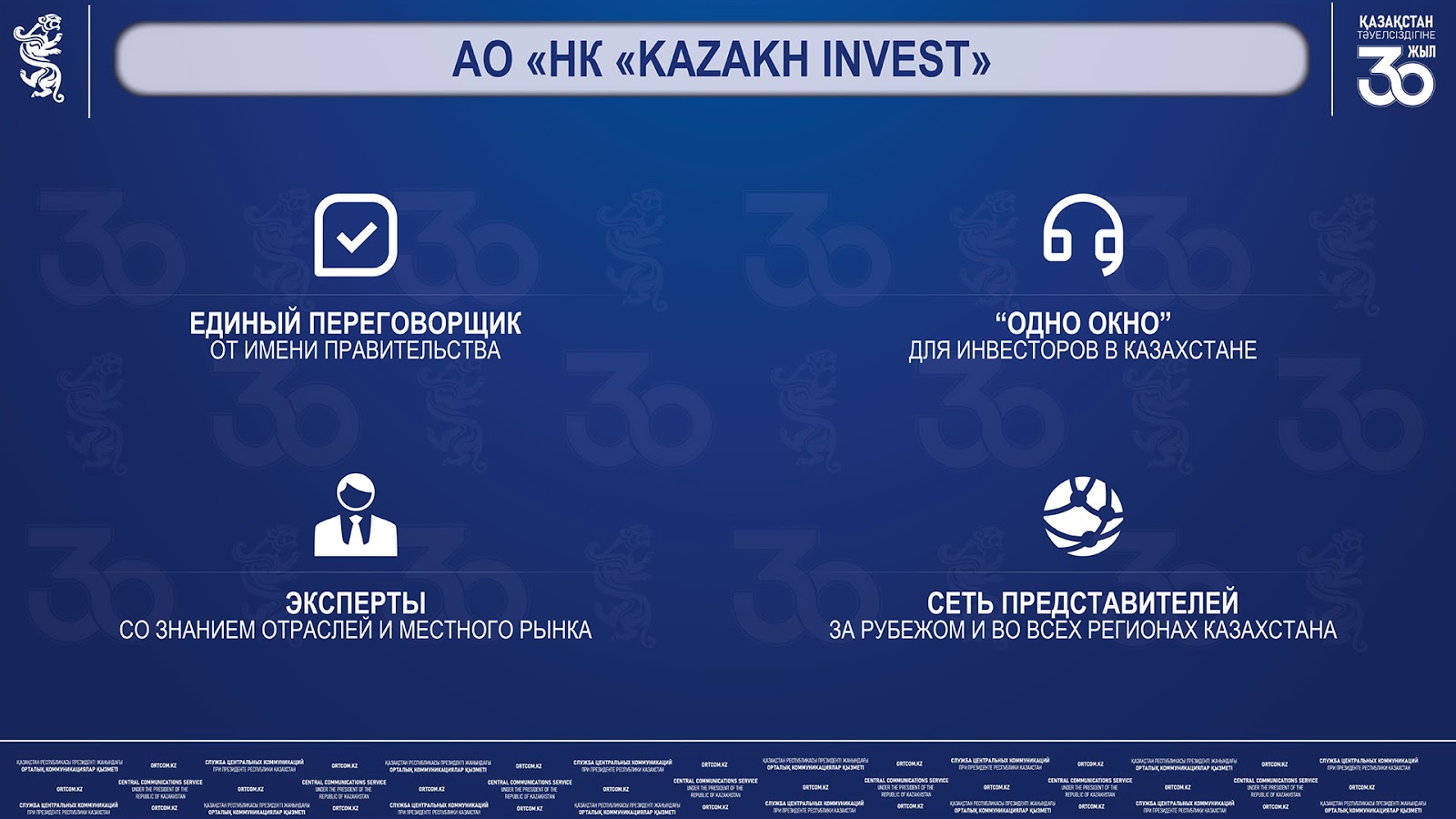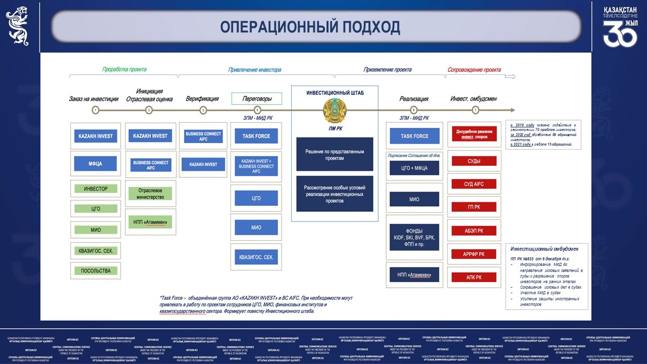 Второе. На базе АО «НК «KAZAKH INVEST» и АО «МФЦА» для повышения эффективности взаимодействия с инвесторами, создана специальная переговорная команда — Task Force.