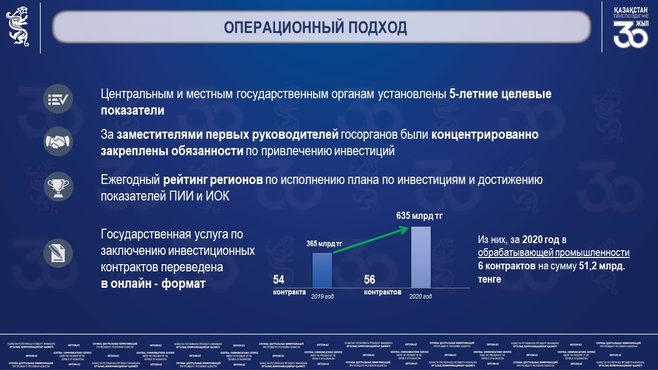 «В целях повышения удобства инвесторов также была автоматизирована госуслуга по заключению инвестиционных контрактов. Благодаря переходу на онлайн режим во время пандемии нам удалось не только сохранить, но и увеличить количество и сумму контрактов за 2020 год до рекордного количества. В итоге за год было заключено 56 инвестиционных контрактов на общую сумму 635 млрд тг, что является самым высоким показателем за последние 10 лет. Из них, 8 контрактов были заключены в сфере обрабатывающей промышленности на сумму 51,2 млрд тг», — А. Зебешев.