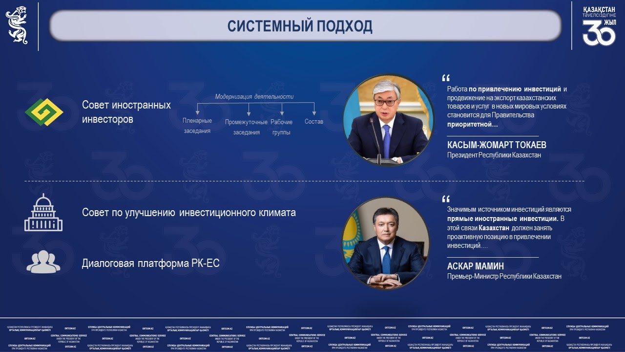 В рамках системных мер проходит активизация глобальных инвесторов и международных финансовых институтов развития, функционируют площадки Совета иностранных инвесторов, Совета по улучшению инвестиционного климата, а также проводятся совещания на диалоговой платформы Казахстан-Европейский Союз.