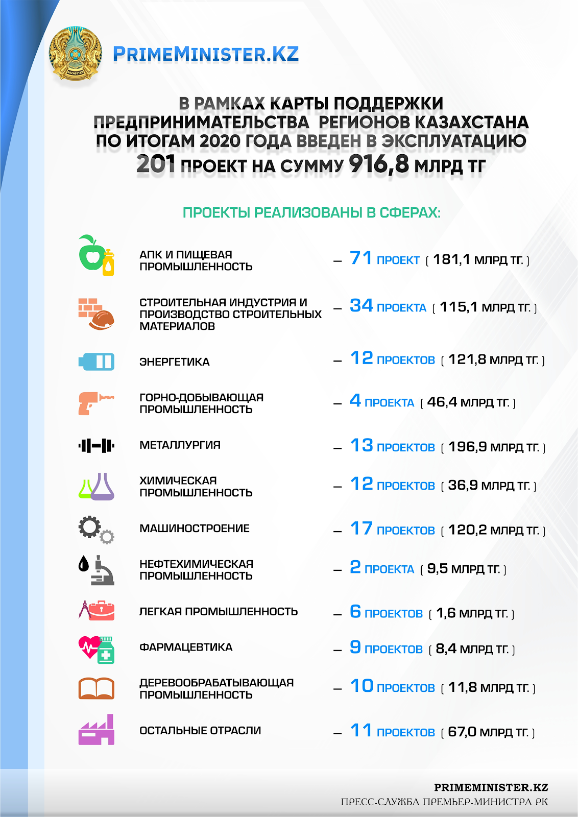 В рамках Карты поддержки предпринимательства регионов по итогам 2020 года введен в эксплуатацию 201 проект на сумму 916,8 млрд тг, с созданием 18,6 тыс. постоянных рабочих мест.